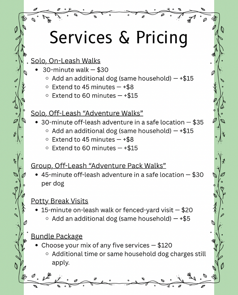 If you’re not sure whether your pup fits the “small dog” category, don’t hesitate to reach out — I’d love to chat and see if Tiny Tails is the right fit for you and your furry friend.